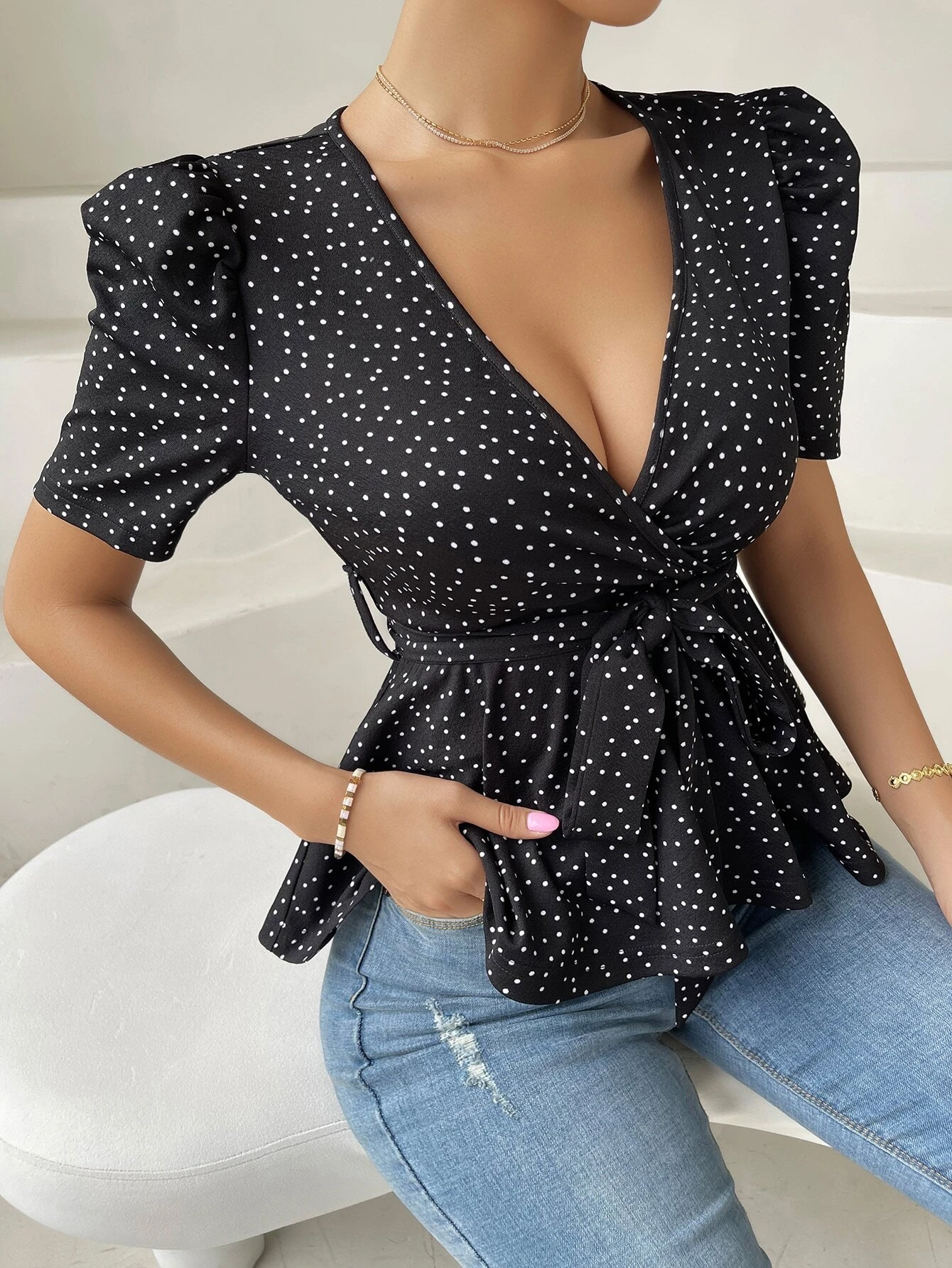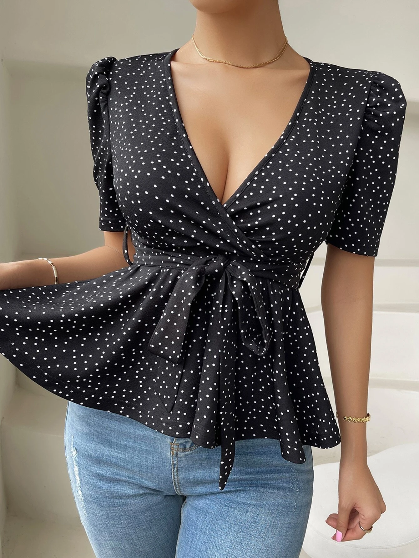 Puff Sleeve Surplice Neck Belted Peplum Tee