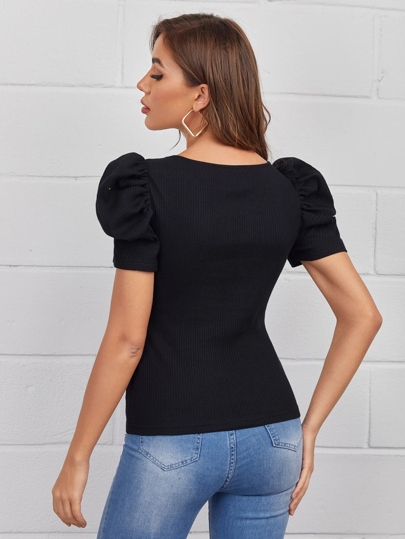 SHEIN Sweetheart Neck Puff Sleeve Rib-knit Tee